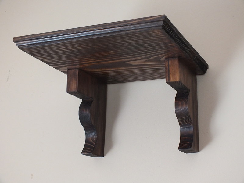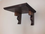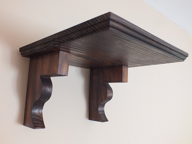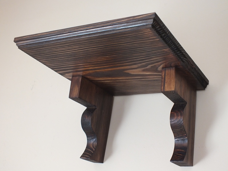 Półka ścienna wykonana z litego drewna sosnowego, bejcowana na kolor orzech, lakierowana.